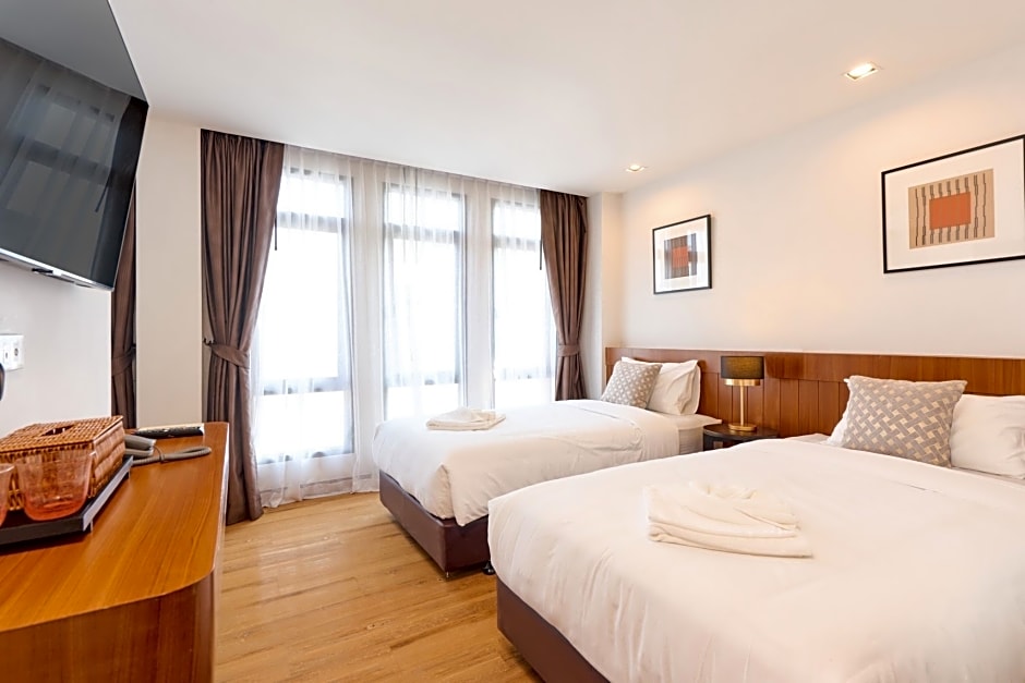 Room options span a variety of layouts, from the Deluxe Studio to the Room - 2 Twin, Groundfloor at 269 sq ft. The Suite, 2 Bedroom offers 538 sq ft of space and accommodates up to four adults, featuring a King bed and two Twin beds. Other configurations include Deluxe Suite (377 sq ft) and Deluxe, King, Bathtub (323 sq ft) which accommodates 2 adults and 1 child, along with Grand Deluxe, King (377 sq ft) and Superior options such as 2 Twin (269 sq ft) and King (269 sq ft).